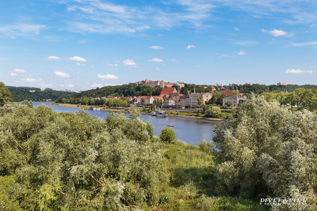 Blick von der Stadtbrücke auf die Altstadt von Pirna - im Vordergrund die Elbe mit Raddampfer