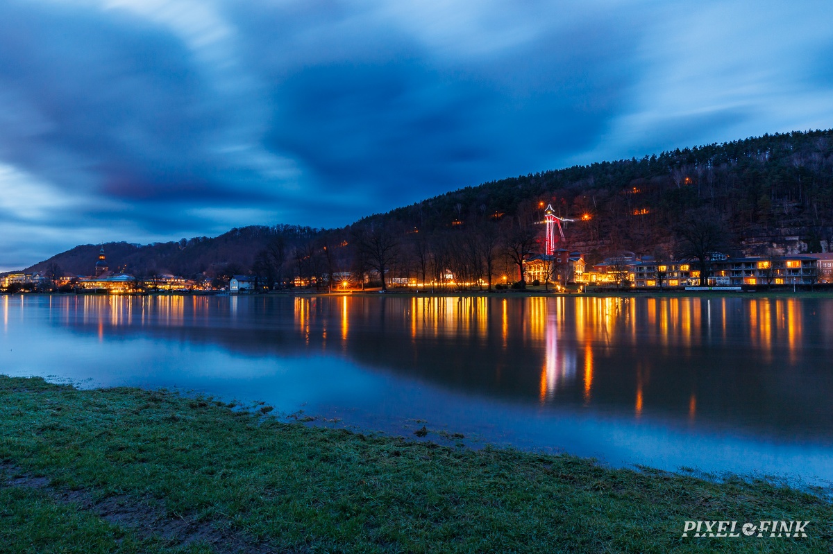 Abendstimmung in Bad Schandau mit weihnachtlich beleuchteten Personenaufzug
