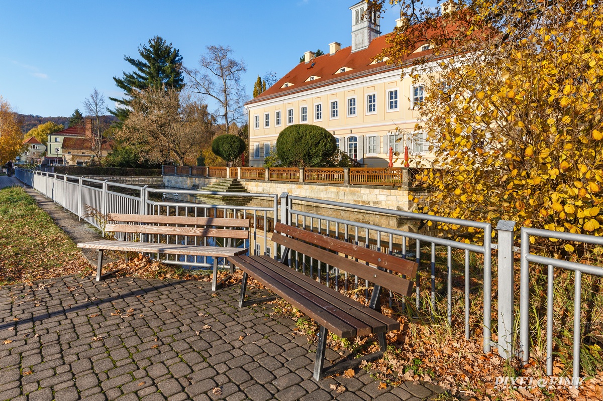 Bäume, Eingang, Gedenktafel Richard Wagner, Graupa, Herbst, Richard-Wagner-Stätte, Sandsteinmauer, Schlosspark, Tor