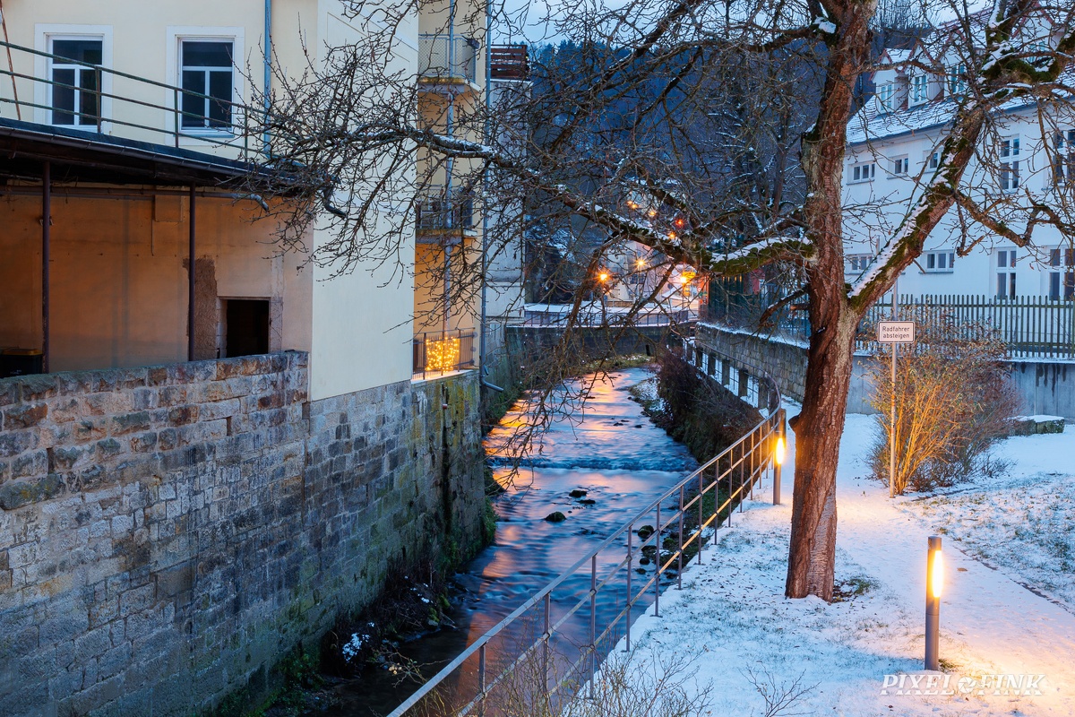 Abendaufnahme, Abendbelichtung, Abendstimmung, Altstadt, Bach, Biela, Blaue Stunde, Kirche, Königstein, Langzeitbelichtung, Sächische Schweiz, Winter, weihnachtlich