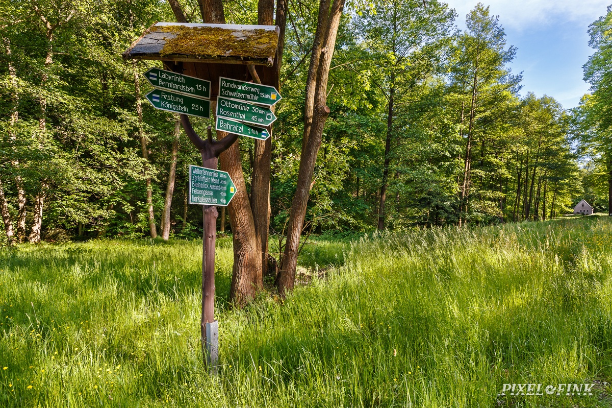 Bielatal, Brausenstein, Felsen, Frühling, Sächsische Schweiz, Waldpfad, Wanderschild, Wanderwegweiser, Wegweiser