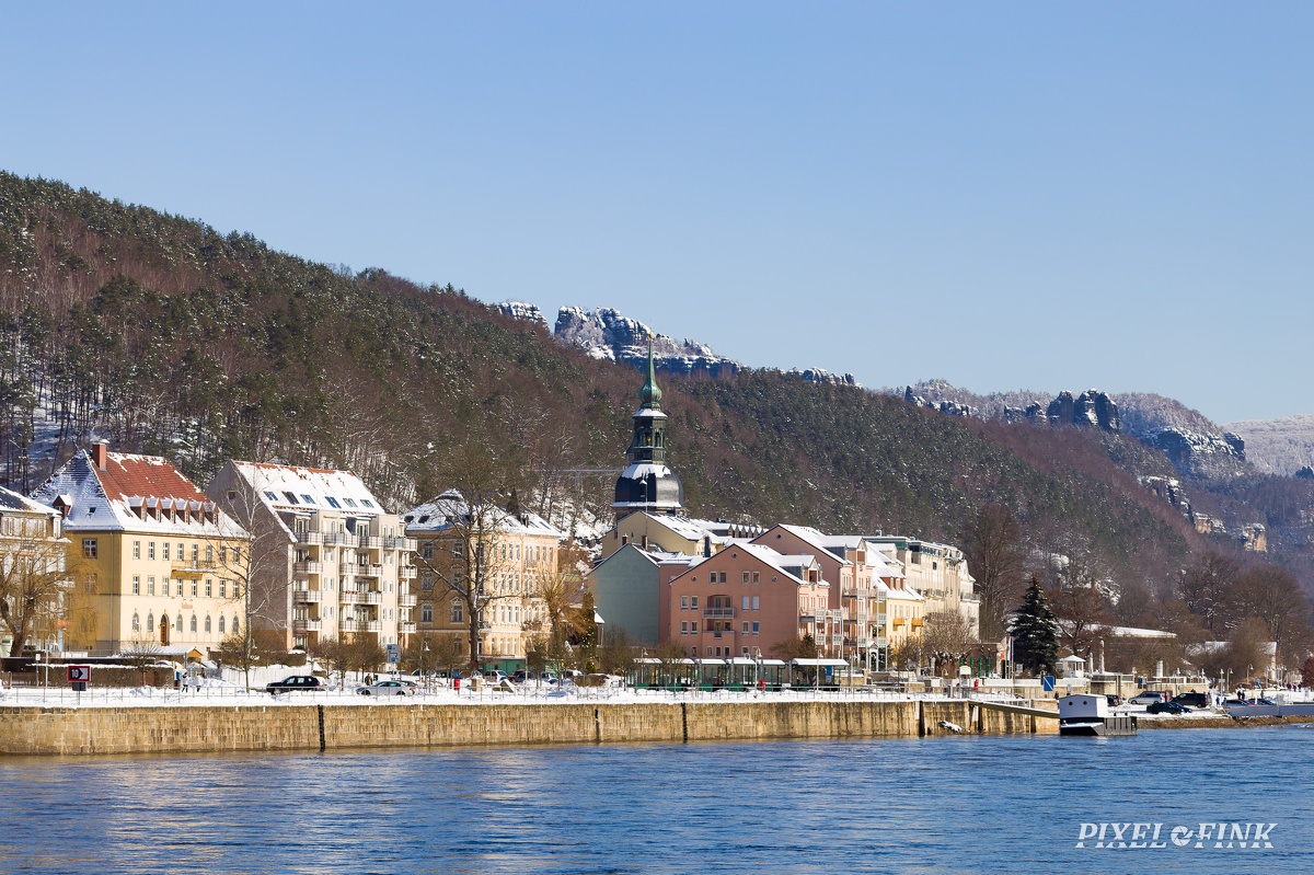 Bad Schandau, Elbe, Elbkai, St-Johannis-Kirche, Winter